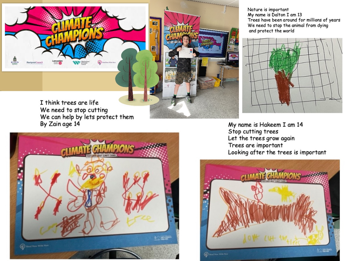 Today, we finished our climate change pledge postcards by writing about the impact of deforestation on our world, the wildlife and their habitats and of course how this affects the global environment such as climate change.