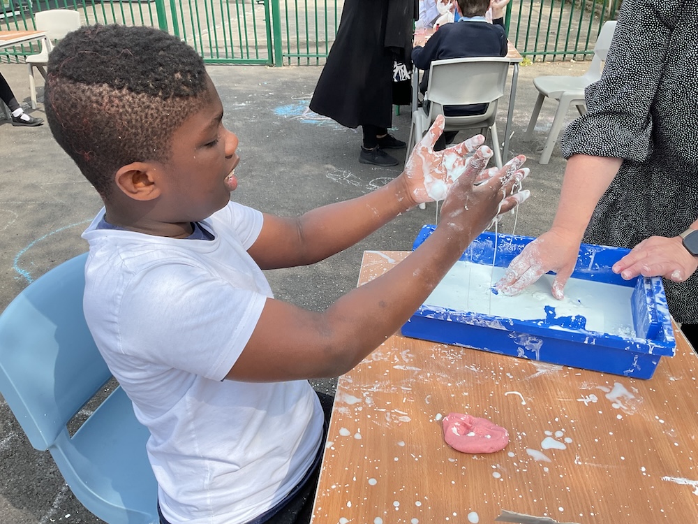 The students have carried out different science experiments in a carrousel. They mixed vinegar with baking powder, made gloop (Non-Newtonian fluid) and made their own play doh.