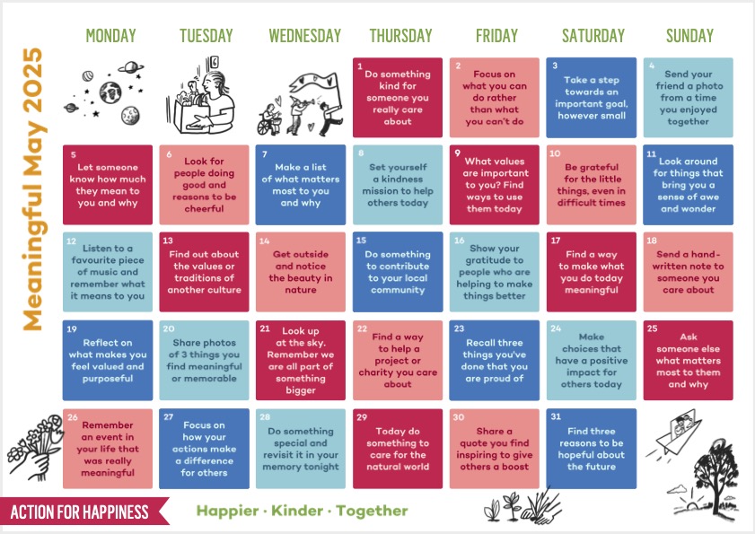 We take wellbeing really seriously in school, and enjoy reflecting on our calendars, to think of ways to make sure we take time to look after our mental health. This month - Meaningful May - has started with lots of lovely weather.