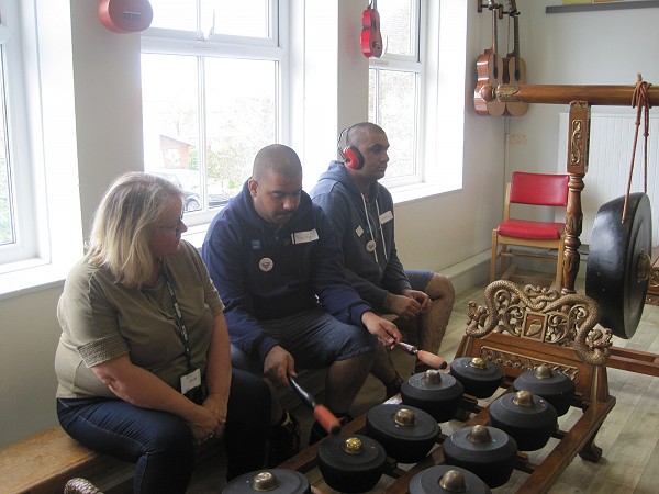 After a yummy lunch of fish and chips we went to another music room were we used loads of different instruments. After that we went for a game of football on the football pitch and played with the parachute.