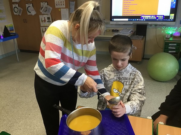 On Monday, S4 enjoyed exploring lots of items in their Halloween tray and creating our pumpkin lantern. They saved the pumpkin flesh to chop and stir with other ingredients to make spiced pumpkin soup.