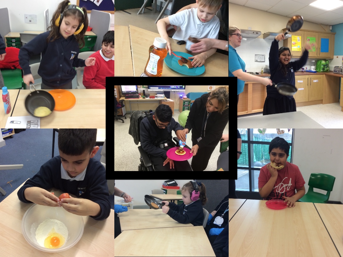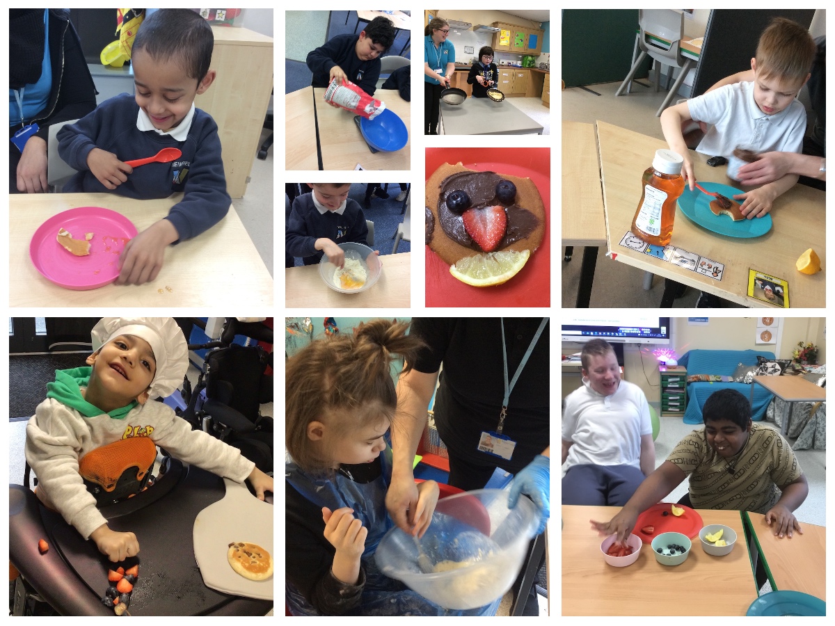 Lots of classes around school have been enjoying exploring pancakes today - they have been pouring milk, stirring, weighing flour, mixing, beating eggs, squeezing, having a go at flipping and then tasting them too.