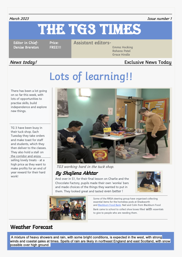 Some of our oldest student have been working on their own newspaper and wanted to share an issue with you all. so, here is the TG3 Times - hot off the press!