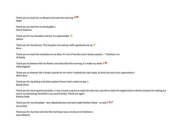 We want to say a big thank you to everyone who has joined in with the random acts, it feels like we are really spreading the love and people have been so thoughtful. Our staff work really hard and we always want to support everyone’s wellbeing - It was amazing!