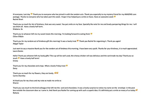 Teacher Rachel Short made the original suggestion and lots of staff got on board with little treats and acts to make others feel appreciated - it’s not about big lavish gifts, just a cup of tea or a kind word is more than enough.