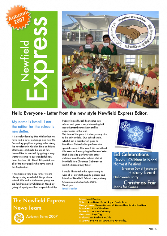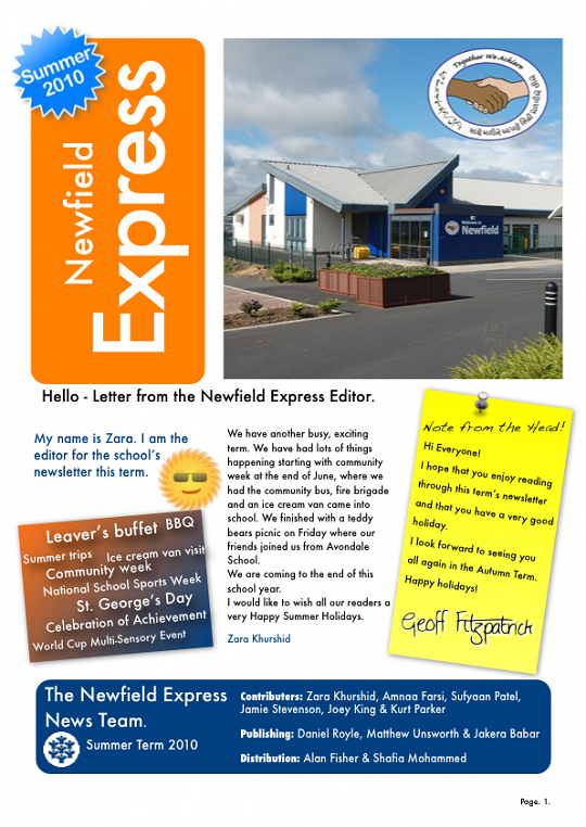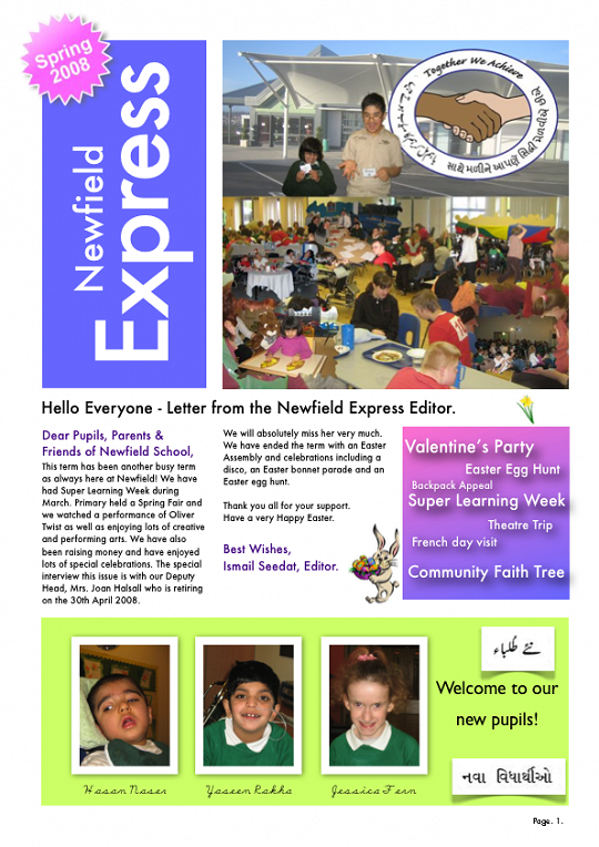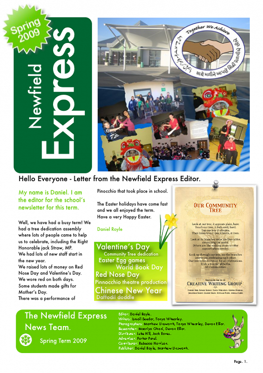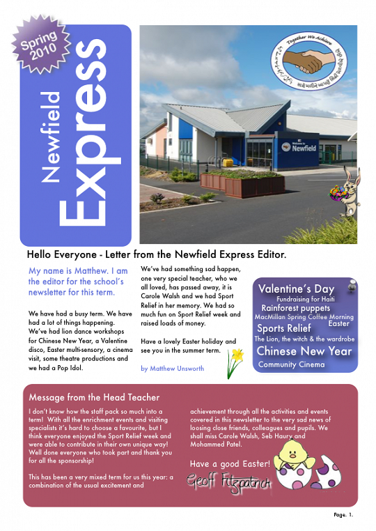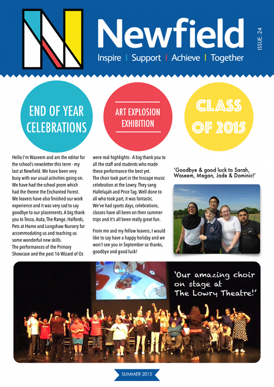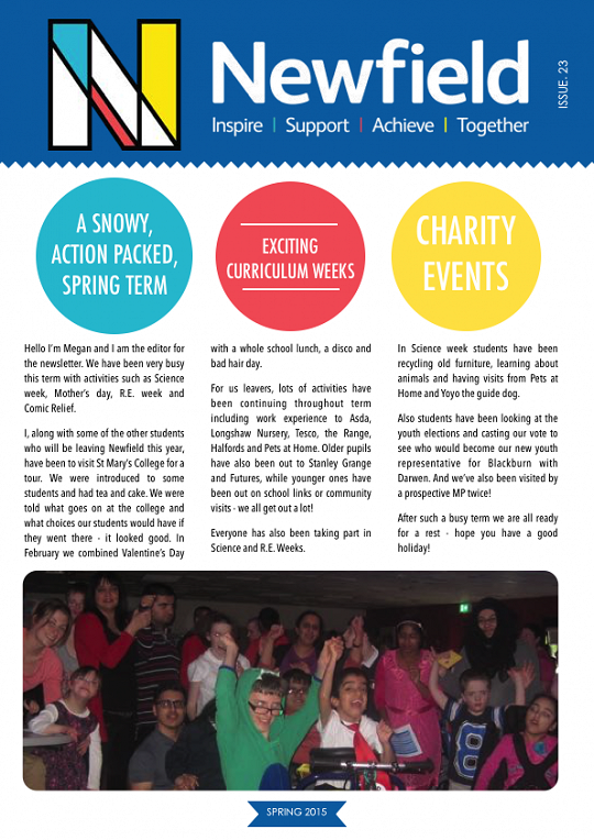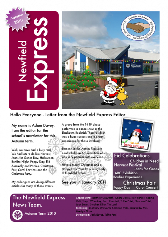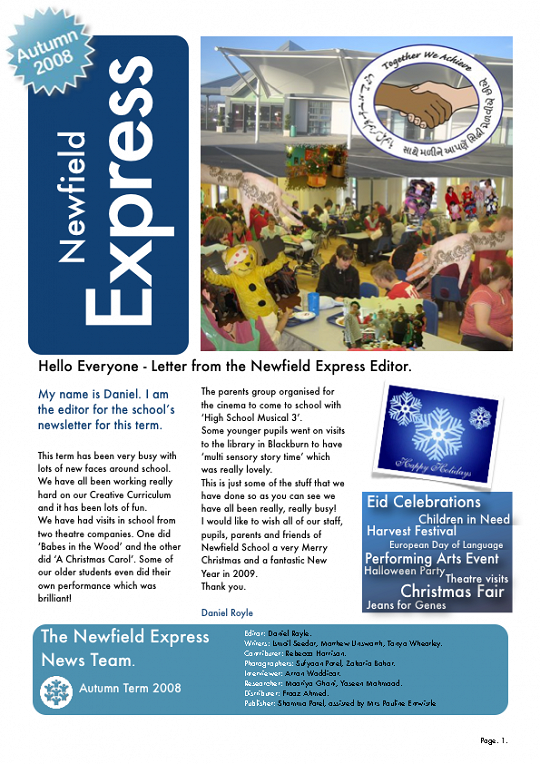 Each term older students, with assistance from staff, put together our newsletter. They really enjoy writing articles, taking photographs, interviewing people and letting everyone know what is happening in and around school – just look at any edition to see how many exciting things are going on all the time at Newfield!