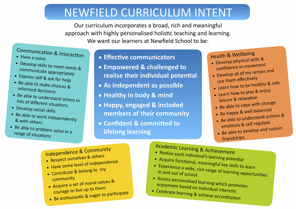 At Newfield we recognise the importance of a curriculum that promotes education, development and care whilst providing exciting and motivating learning opportunities for all our learners.